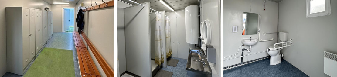 Il prefabbricato è una struttura di 28 m2 di superficie utile composti da: 1 spogliatoio, 1 locale con lavabo e 4 punti doccia, annesso all'esterno servizio per disabili a norma SIA 500.